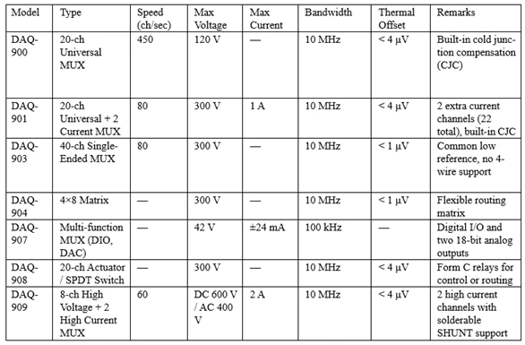 DAQ-9600 sistem podržava sedam modularnih kartica koje se mogu instalirati u glavni okvir. Svaki modul nudi specifične mogućnosti kako bi se prilagodio širokom spektru tipova signala i potreba za merenjem. Sledeća tabela ističe ključne električne karakteristike i funkcionalnosti svakog modula, posebno one vezane za merenje struje: