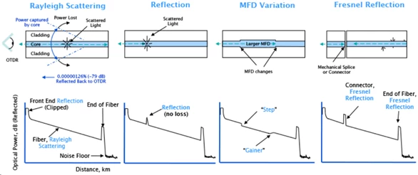 Generisani svetlosni puls ima tipično trajanje u nanosekundama, najčešće od 3ns do 20000ns, i naziva se širina pulsa (pulse width). Što je veća širina pulsa, više “mesta” zauzima u vlaknu i smanjuje granulitet odnosno rezoluciju merenja, ali zauzvrat ima veću snagu i može prodreti dalje u vlakno. Taj svetlosni puls se reflektuje od sve imperfekcije u vlaknu i vraća se nazad u instrument. S obzirom na poznatu brzinu propagacije svetla, kao i proizvođački definisan indeks prelamanja svetla u vlaknu (IOR – Index of Refraction), OTDR prezicno može okarakterisati mereni link. Pomenuta karakteristika merenog vlakna je tipična za različite tipove događaja, a na algoritmu koji se nalazi u OTDR-u je da prepozna ove događaje i prikaže ih pomoću mape ikonica, tabele događaja ili slične reprezentacije koja je daleko lakša za tumačenje. Svakako, nekad je neophodno pogledati trag kako bi uspešno razumeli šta se dešava u vlaknu.