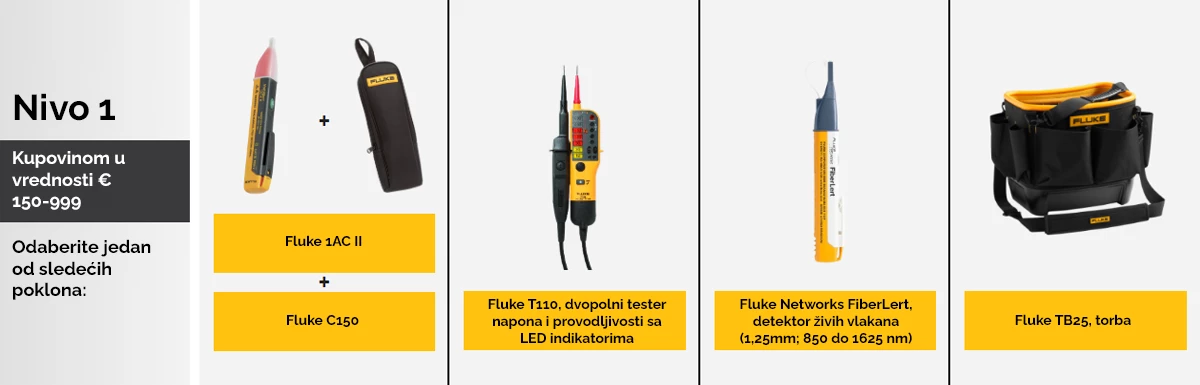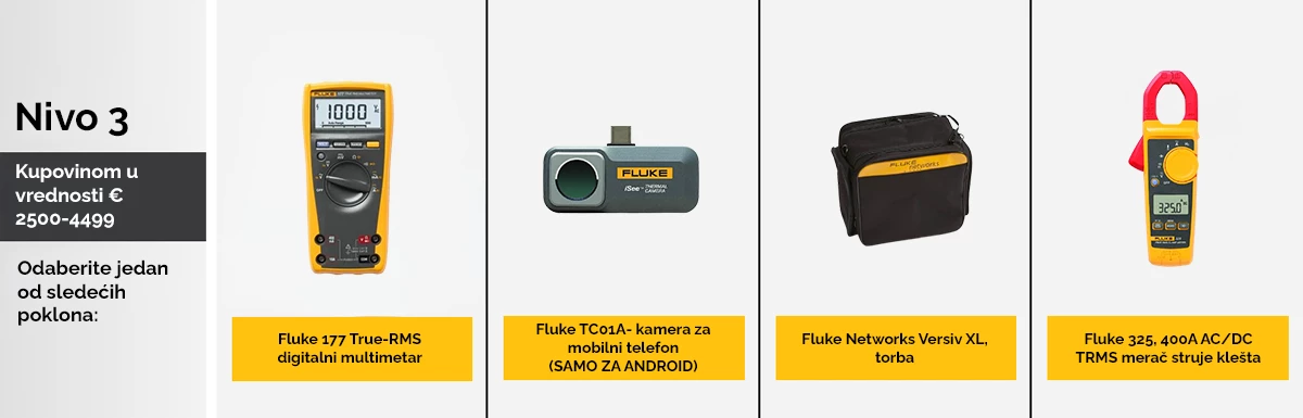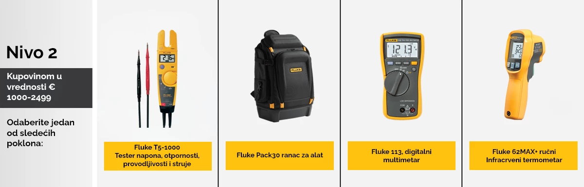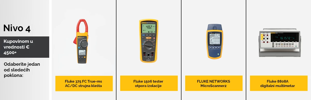Prilikom kupovine proizvoda iz programa Fluke Industrial, Fluke Calibration i Fluke Networks ili Beha Amprobe u vrednosti preko 150 € + PDV, dobijate poklon Fluke proizvod. Što je veća vrednost vaše kupovine, veća je i vrednost poklona.