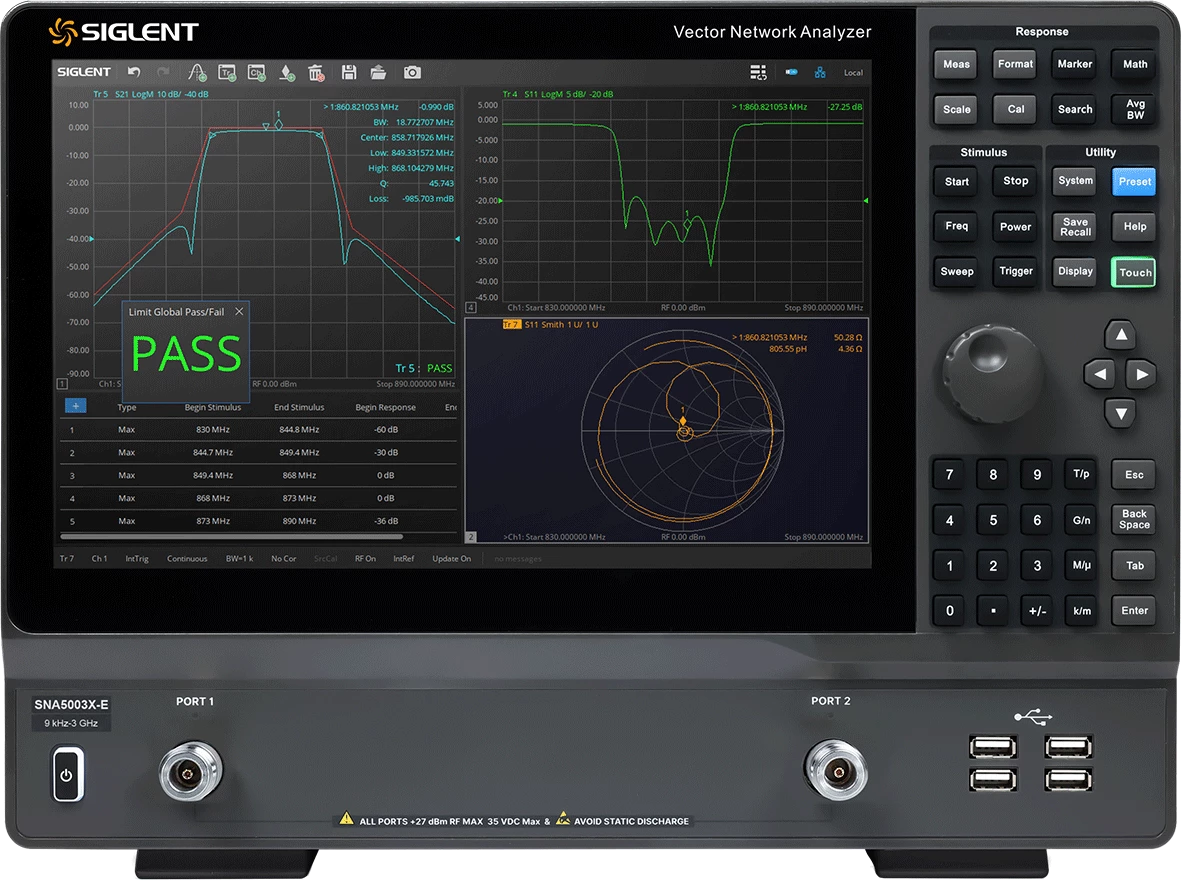 - SIGLENT SNA5000X-E serija vektorskih mrežnih analizatora ima frekvencijski opseg od 9 kHz do 6.5 GHz, koji podržava merenje parametara sa 2-porta za raspršenje, diferencijalni parametar i merenja parametara u vremenskom domenu.